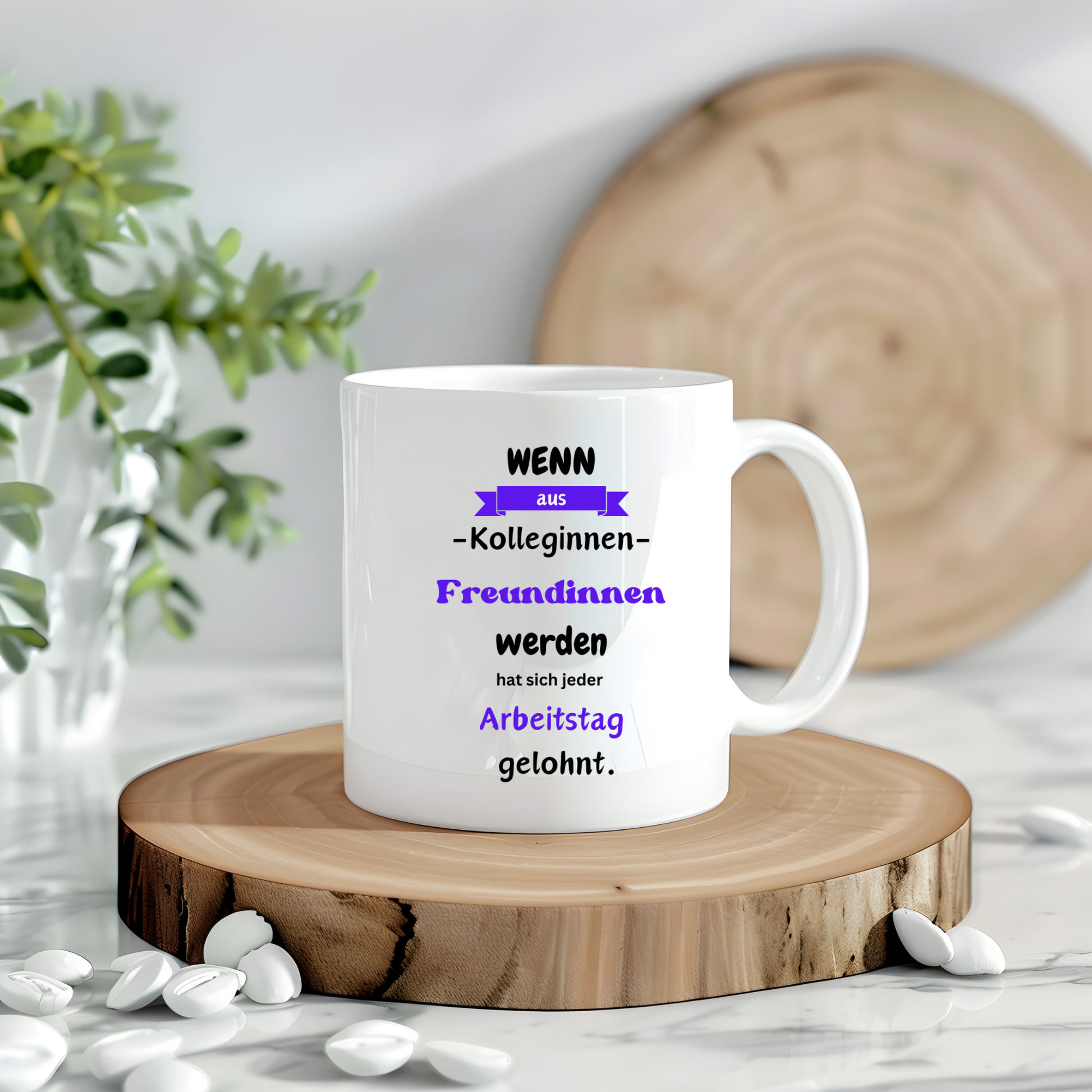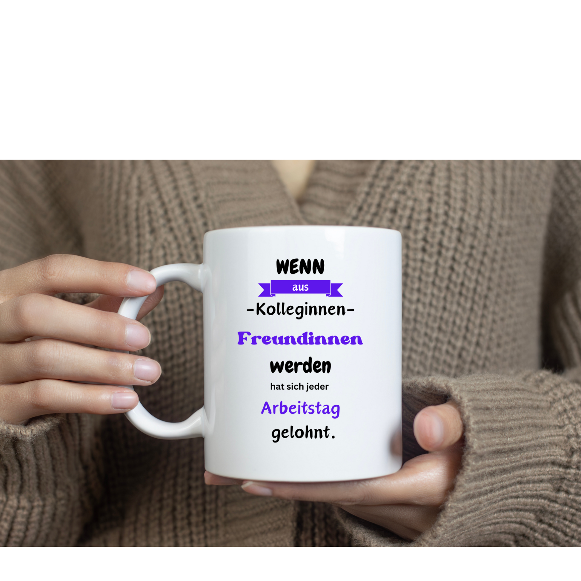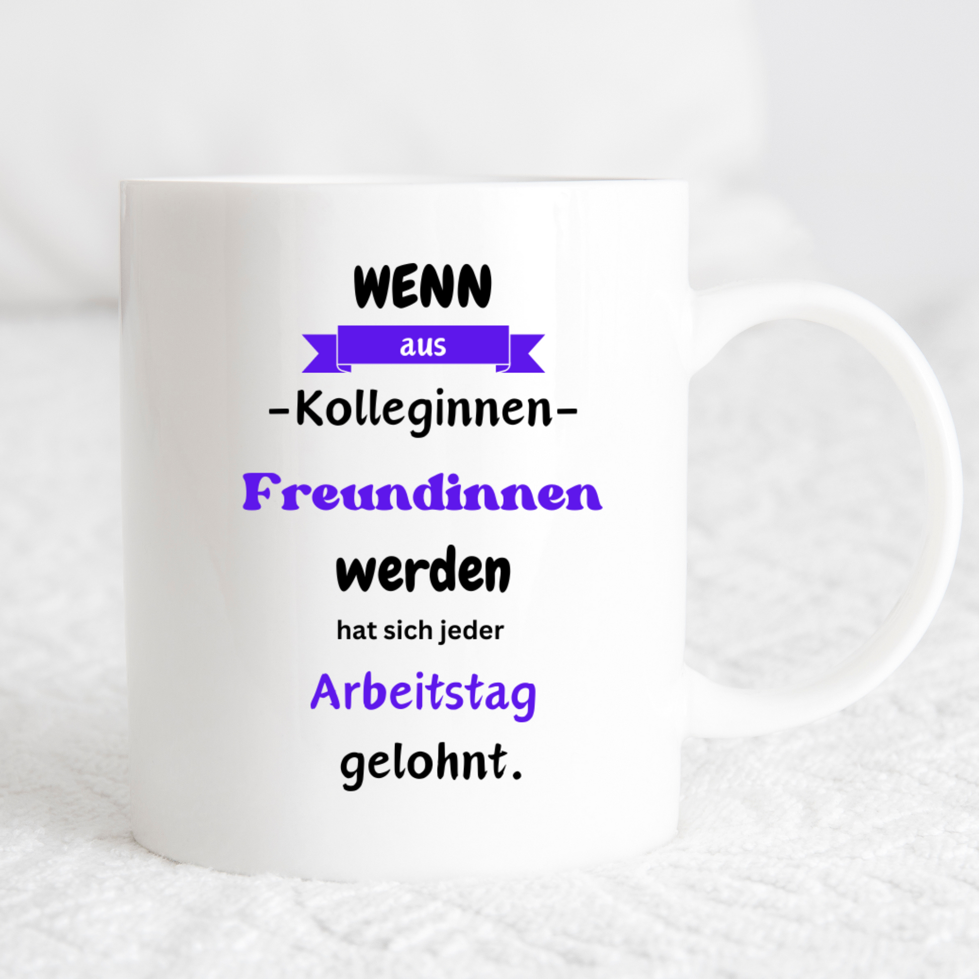 Keramiktasse/Weiß „Wenn aus Kolleginnen Freundinnen werden hat sich jeder Arbeitstag gelohnt“ Lila